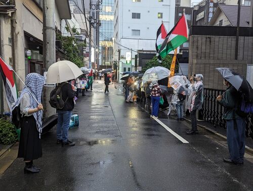 2025年4月28日夕方、雨が降りしきる中、東京・四谷三丁目の日本エヤークラフトサプライ(NAS)本社前に45人が駆けつけ、コールやスピーチでエルビット・システムズ製の自爆型ドローン「SkyStriker」の輸入から手を引くよう要求しました。 「イスラエルの軍需…