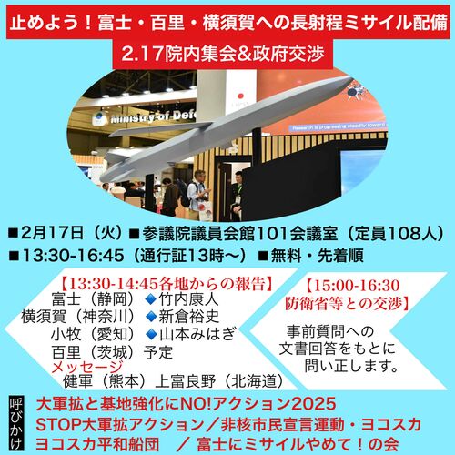 2026年2月17日の長射程ミサイル配備に関する防衛省交渉 質問事項 【共通項目】1.昨年8月の防衛省による長射程ミサイルの配備計画の発表以降、配備の対象となった地元自治体(都道府県、市町村)に対して行なってきた情報提供や説明の一切を明らかにされた…