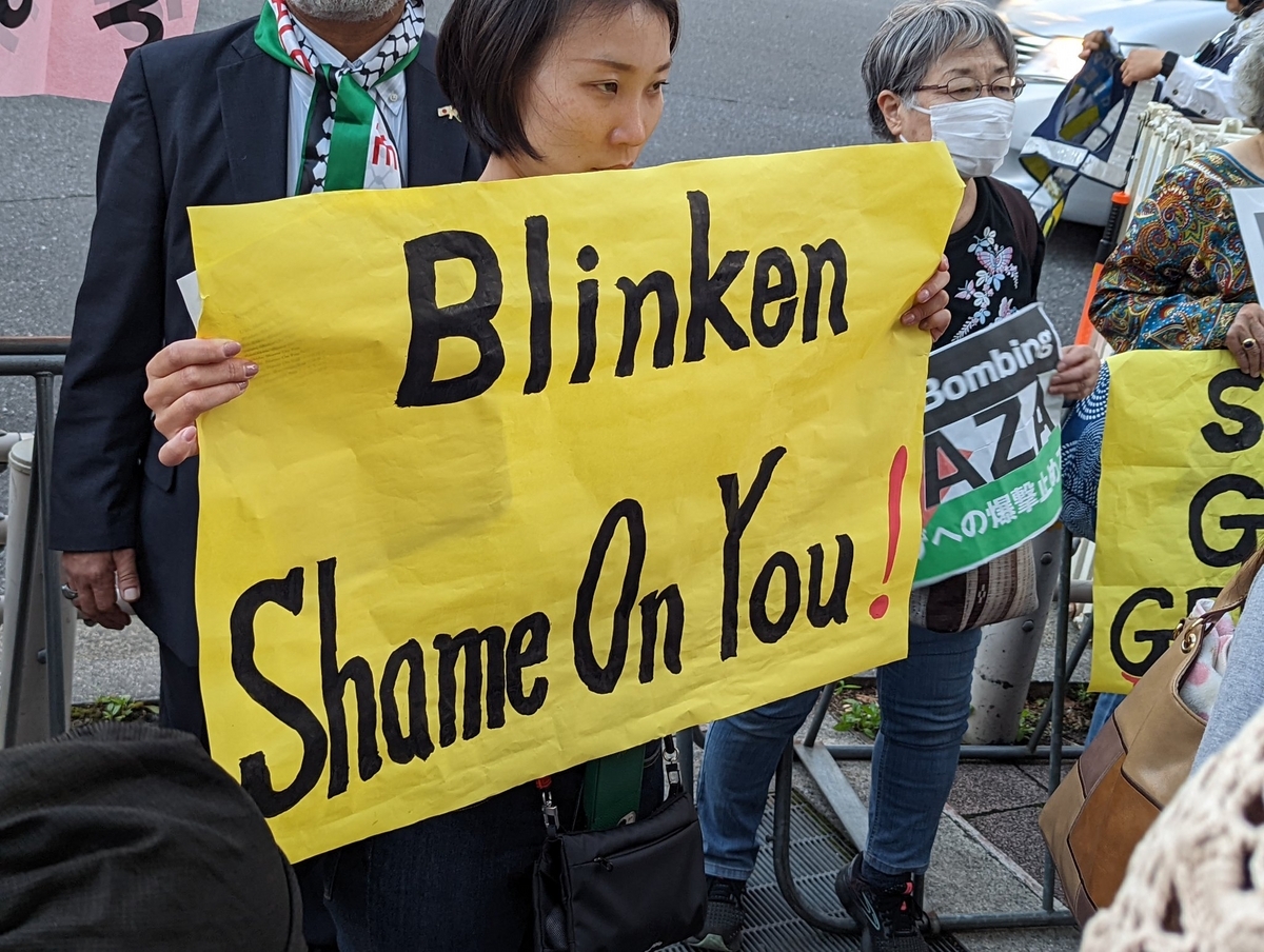 「G7は大虐殺をやめさせろ」「G7は即時停戦させろ」「G7は経済制裁を行え」「G7は恥を知れ」「ブリンケンは恥を知れ」「上川は恥を知れ」「子どもを殺すな」「誰も殺すな」「ネタニヤフ逮捕」「Stop Gaza Genocide」「G7,Shame On You」「Free Free Gaza」「Free Free Palestine」などのシュプレヒコールをぶつけながら、参加者が発言。
